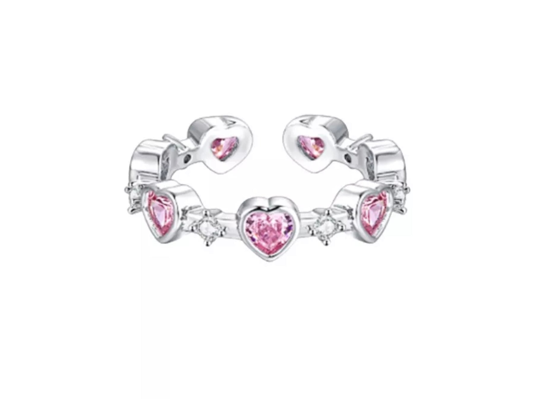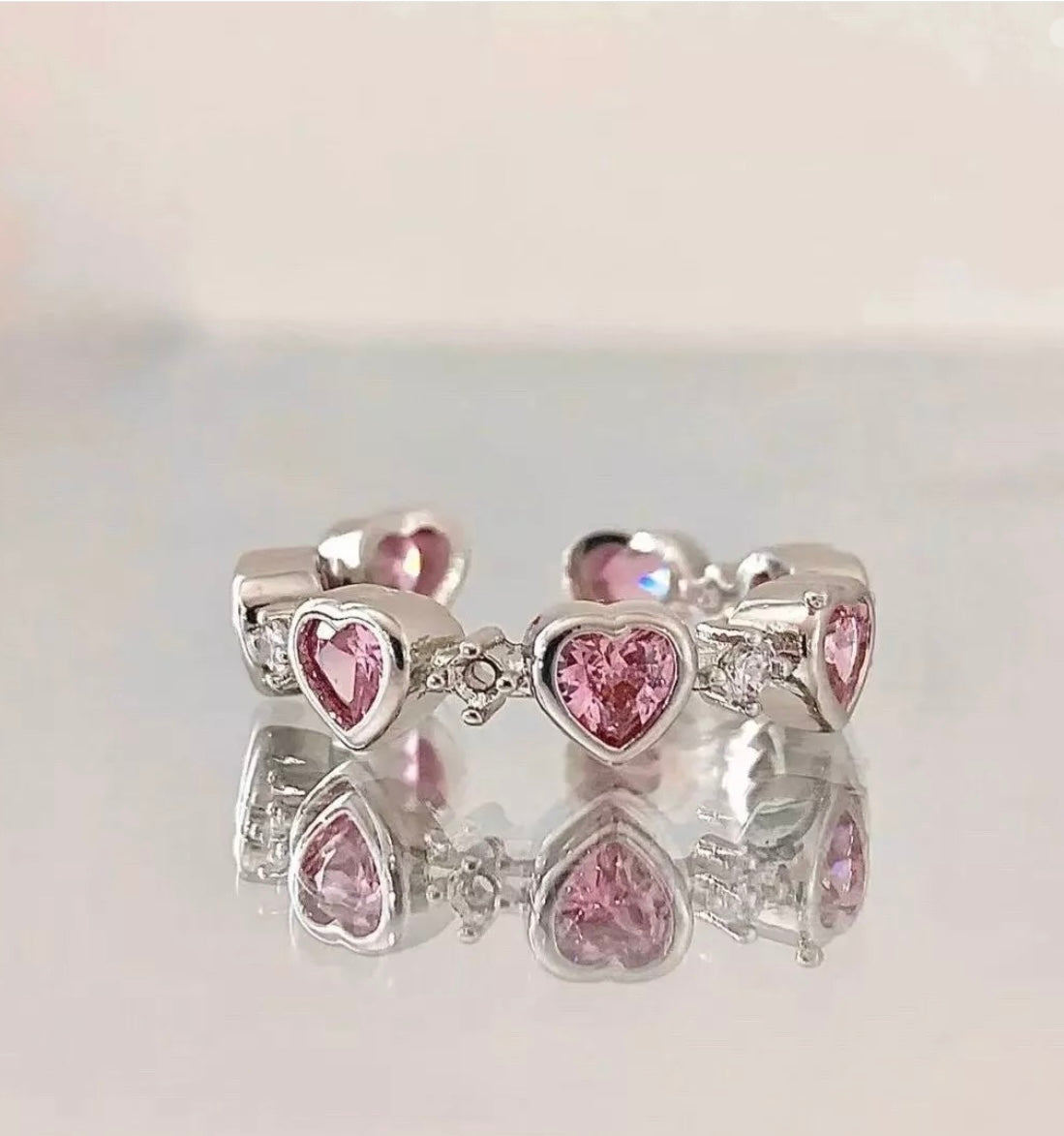 This ring is a charming piece of jewelry featuring a series of heart-shaped designs. Crafted in a sleek silver tone, it showcases multiple pink heart-shaped gemstones that exude a sweet and romantic vibe. The ring is an open design, making it adjustable and suitable for different finger sizes. Between the pink heart gems, there are small clear stones that add a touch of sparkle and elegance. Whether worn alone or paired with other rings, it’s a stylish accessory that can easily elevate any look, perfect for those who love cute and feminine jewelry.